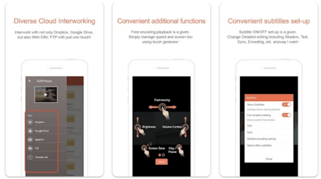 The key features and benefits are: customizable playback options like playback speed and sync subtitles; an extensive range of media formats support, e.g. AC3, FLV, MP4, AVI, MOV, DAT, MKV, and more; advanced playback features, e.g. loop and shuffle modes, A-B repeat, and support for multiple playlists; built-in media browser to browse and play media files directly from the app; support streaming media from Chromecast, AirPlay and DLNA-enabled devices; etc.